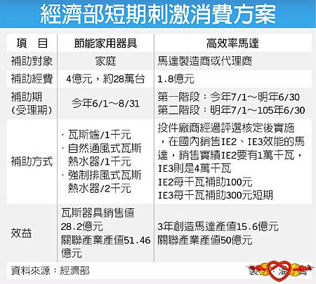 新一波刺激經濟方案今(22)日傍晚宣布,經濟部長張家祝表示,為刺激消費、提振經濟,將推出2項補助計畫,分別為節能家用器具補助計畫及高效能馬達示範推廣補助計畫,預估可創造百億元產值。