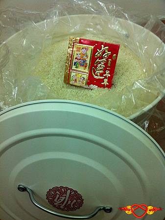 ◎米桶:不免俗一定要貼上「滿」字,裝八分滿或添滿。上面放紅包,代表入住後可以衣食豐足