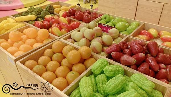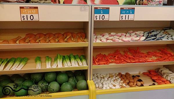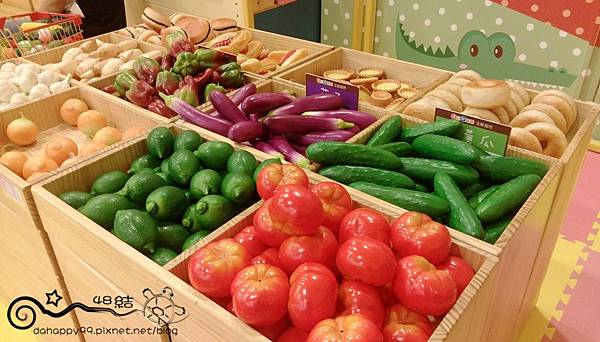 有各式各樣的魚、蝦、蔬果、麵包、牛奶的模型玩具